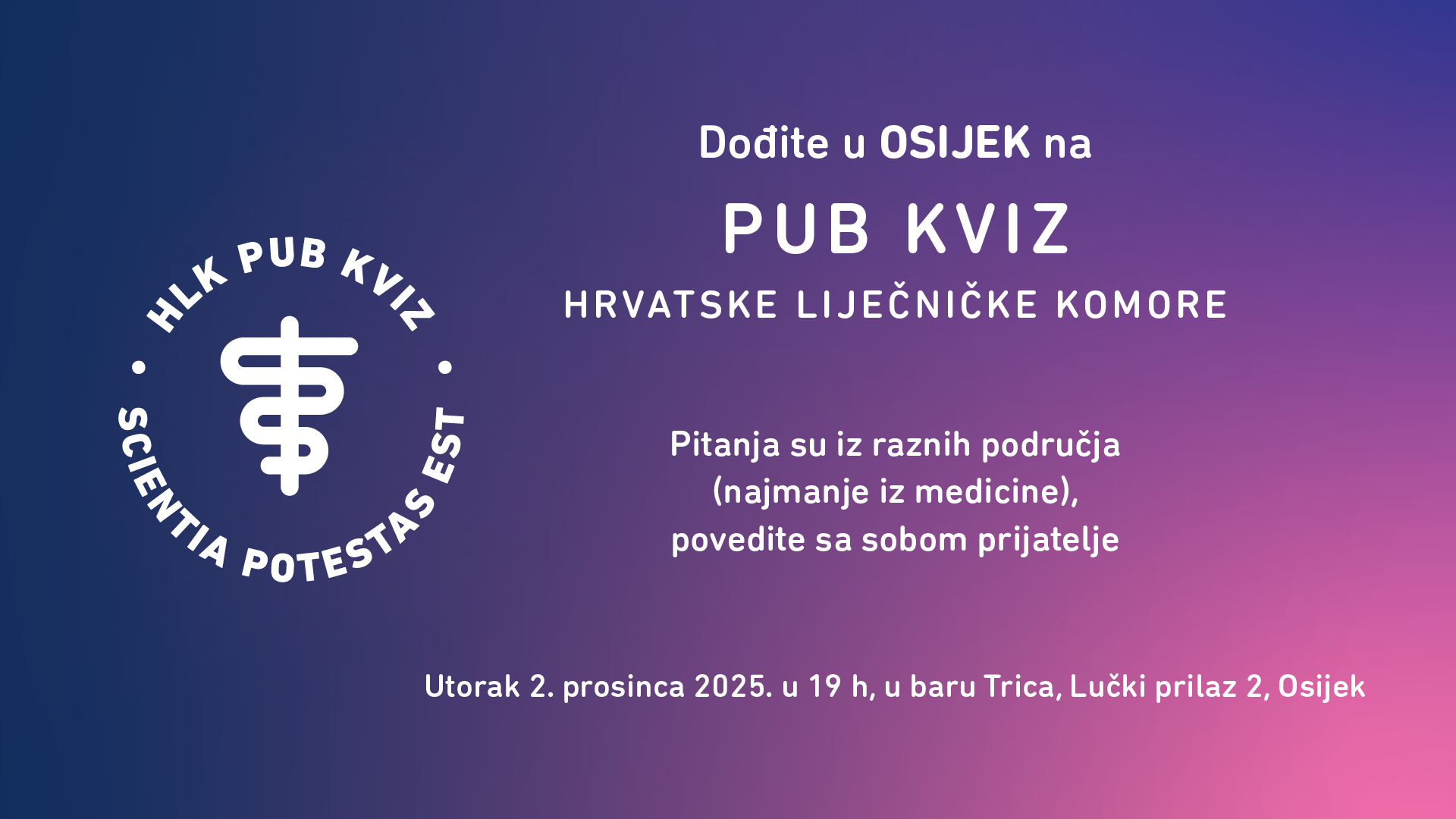 Dođite i zabavite se na Pub kvizu Hrvatske liječničke komore koji će se održati u utorak, 2. prosinca 2025. u 19 sati u baru Trica, Lučki prilaz 2, Osijek. Pitanja su iz raznih područja (najmanje iz medicine), povedite sa sobom prijatelje!